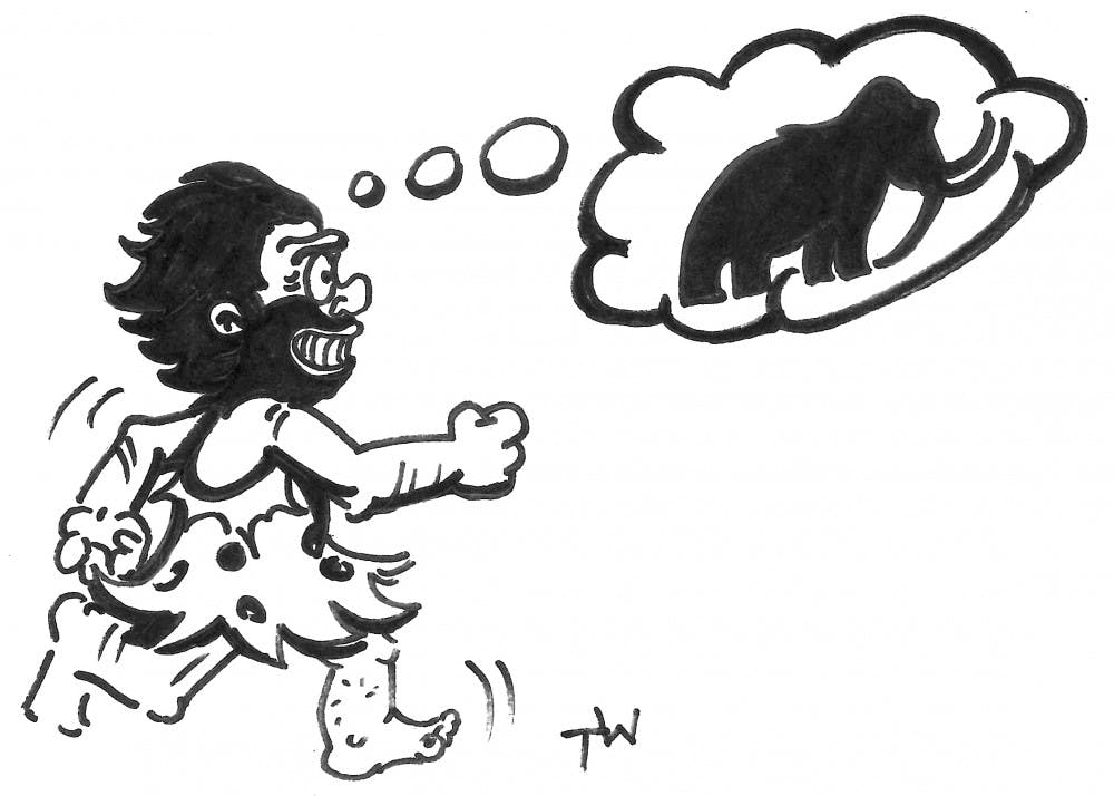 In order to synthesize these random features into a meaningful claim, I’ll need to mention two other remarkable differences between Australopithecus afarensis (us) and chimps. Archeologists have found that as we stood erect our heads and jaws shrunk, our brains grew, and we began eating meat. Our new diet that included meat gave our brains nutrients for it to grow. Meat is also not as tough as the roots and herbs chimps eat so we no longer needed big heads and jaws to chew through those veggies. To eat meat we had to kill the meat, but archeological digs have determined that we did not create weapons for another million years.