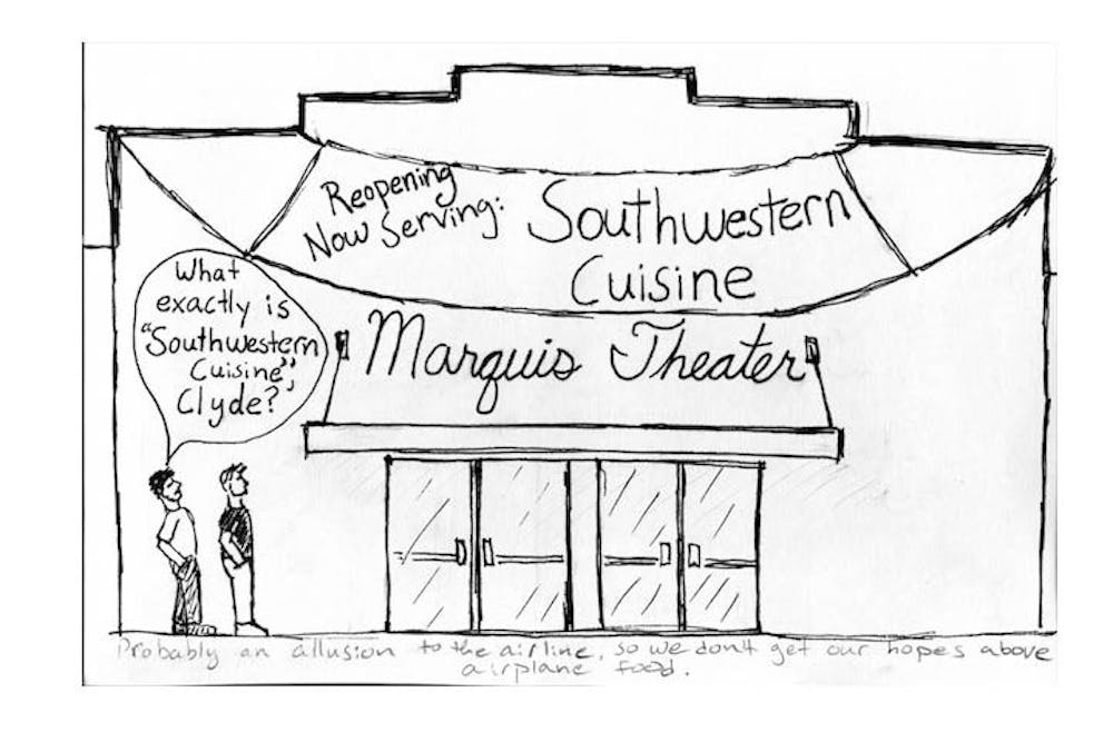 I ask these questions in advance (at least when I’m writing this) of the highly anticipated re-opening of the Marquis Theater on Main Street, which began welcoming patrons this past Monday, Nov. 3. The theater, recently acquired by new owners, will boast an almost entirely re-done interior, in addition to offering....MEXICAN FOOD! (On their website it says Southwestern food, but as far as I’m concerned Southwest is an airline, not a cuisine.)