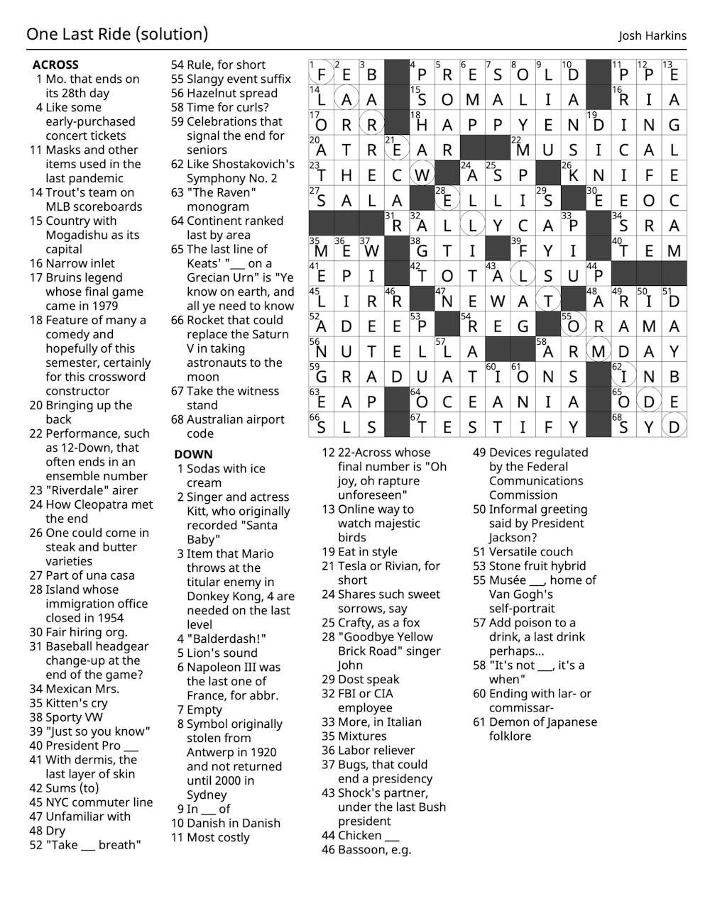 Arts & Culture Crossword 05/08/2025 Solution: One Last Ride Crossword 05/08/2025 Solution: One Last Ride! Comments Please enable JavaScript to view the comments powered by Disqus.