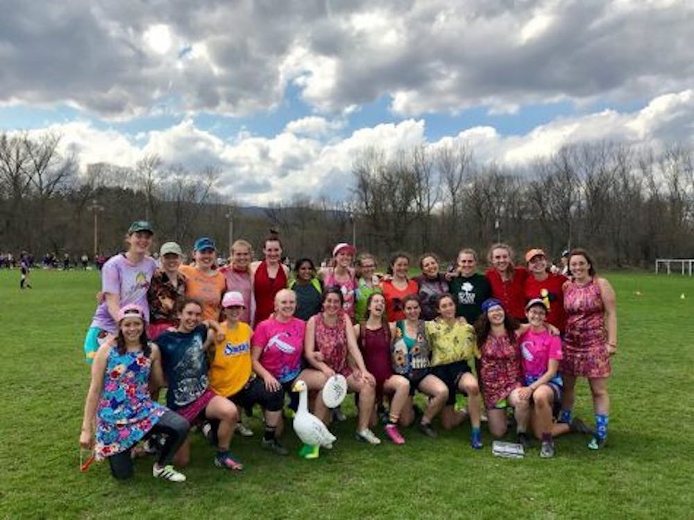 Members of the women’s frisbee team smile and pose at the 2018 Northeast Women’s DIII Regional Championship.